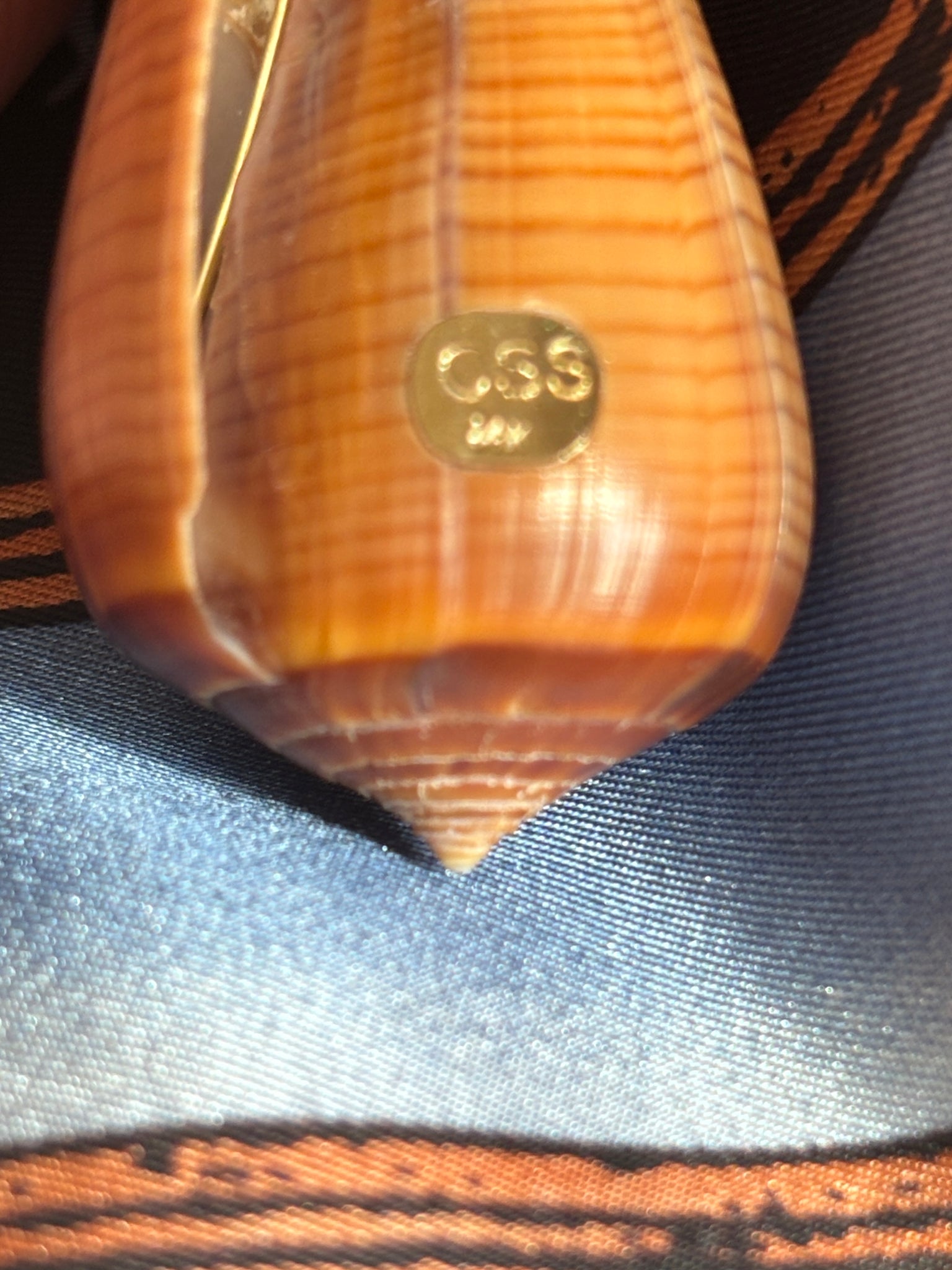 Brown Conus Shell makes a perfect background for this gorgeous, London Blue Topaz. Set in 14-karat Gold, this a fine piece for day or evening. - Signed CSS - 14-karat Gold, 2.5" long