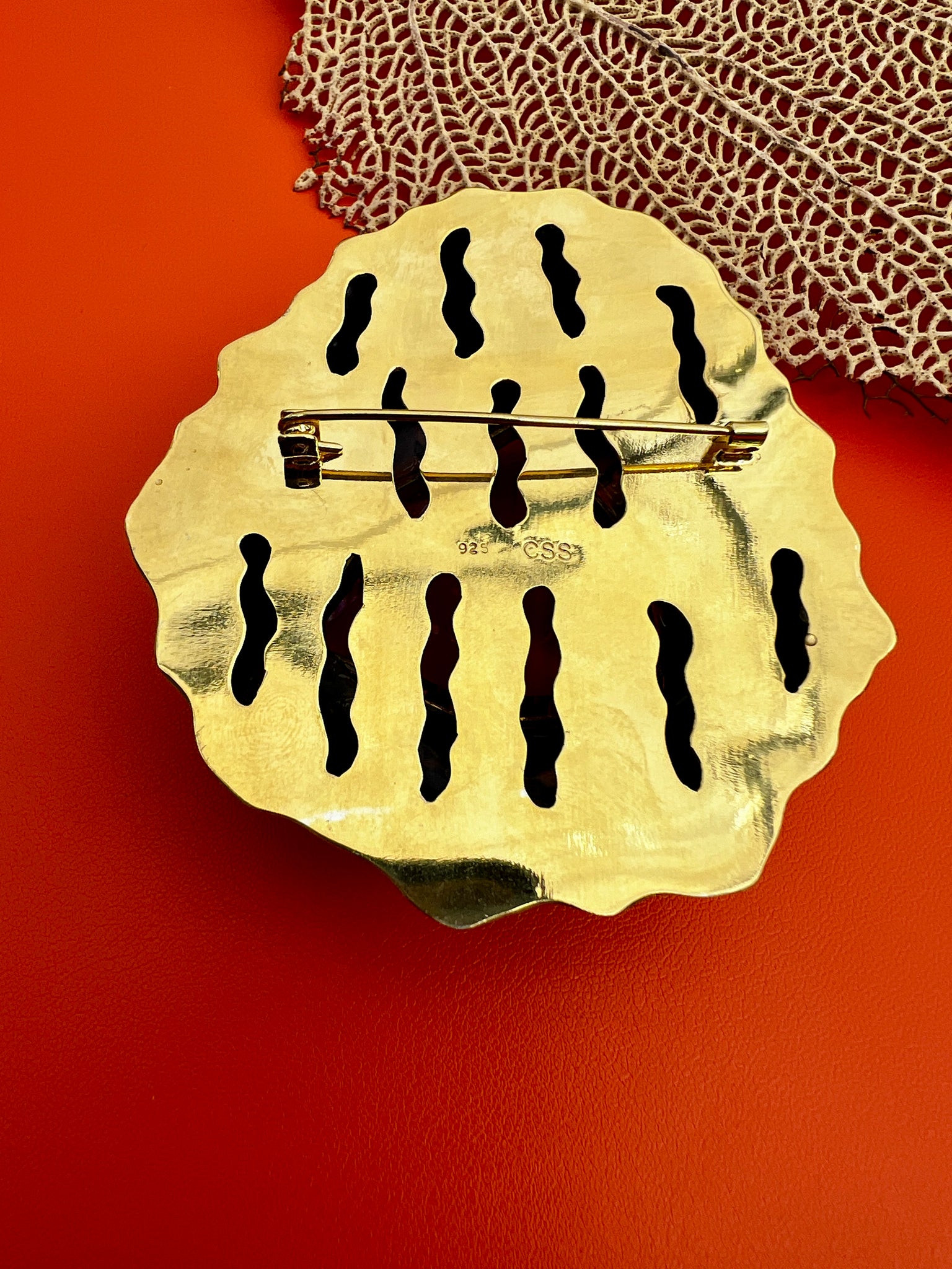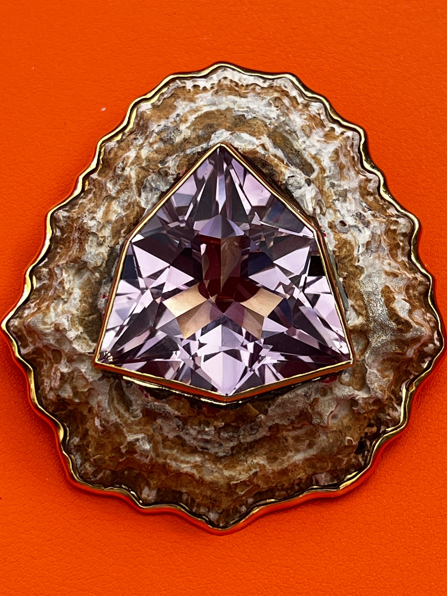 Incredible, large Brooch made from an unusual, very large African Limpet set with a 135.14 Carat Bishops-cut Amethyst. This piece is amazing - super look on a waistline or belt, as well as traditional spots like a wool suit! Signed CSS - Vermeil -3" Across -3" Long