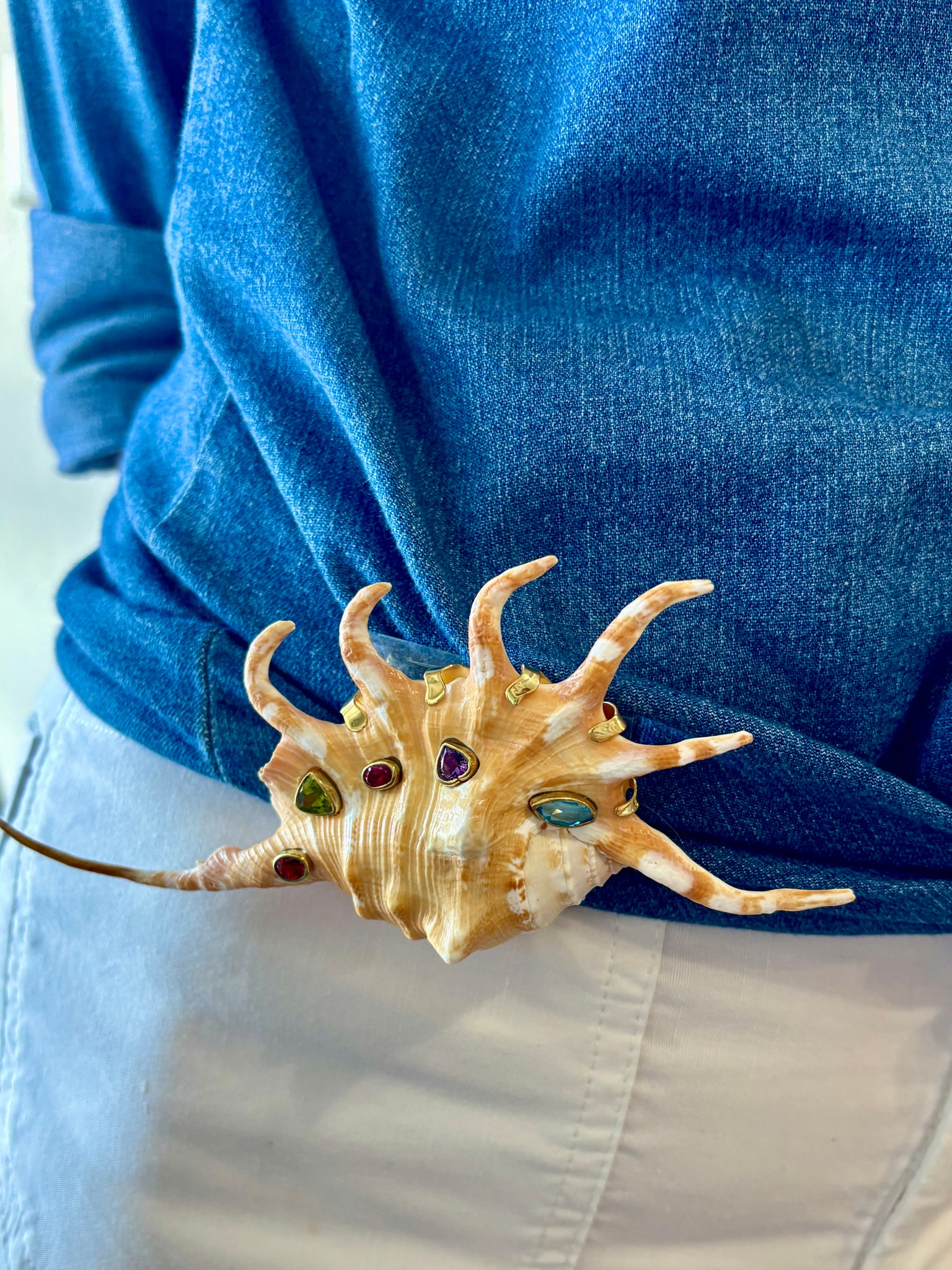 Spider Conch Brooch set with various brilliant gemstones: Topaz, Garnets, Peridot and Amethyst. Great Accent piece on a belt or waistline, or on a lapel. Brooches are IN! - Signed CSS - Vermeil - 6" Long