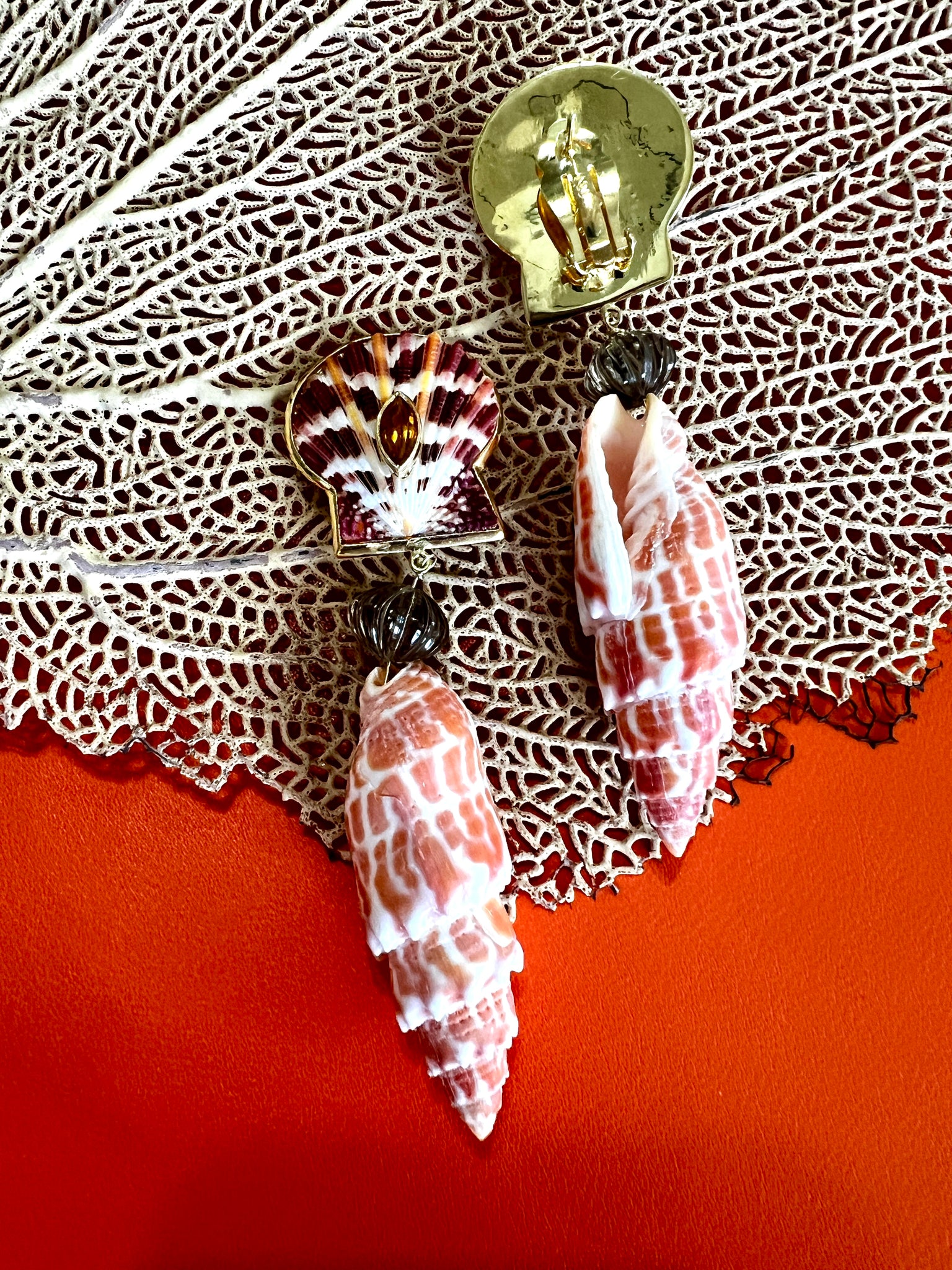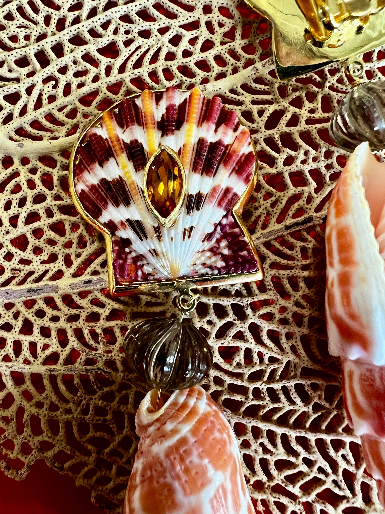 Calico Scallops with Beer Citrines set off the elegant and special Mitre Shell dangler earrings. Adds interest to any outfit. Signed CSS - Vermeil - 3.25" Drop - Clip/Post Back