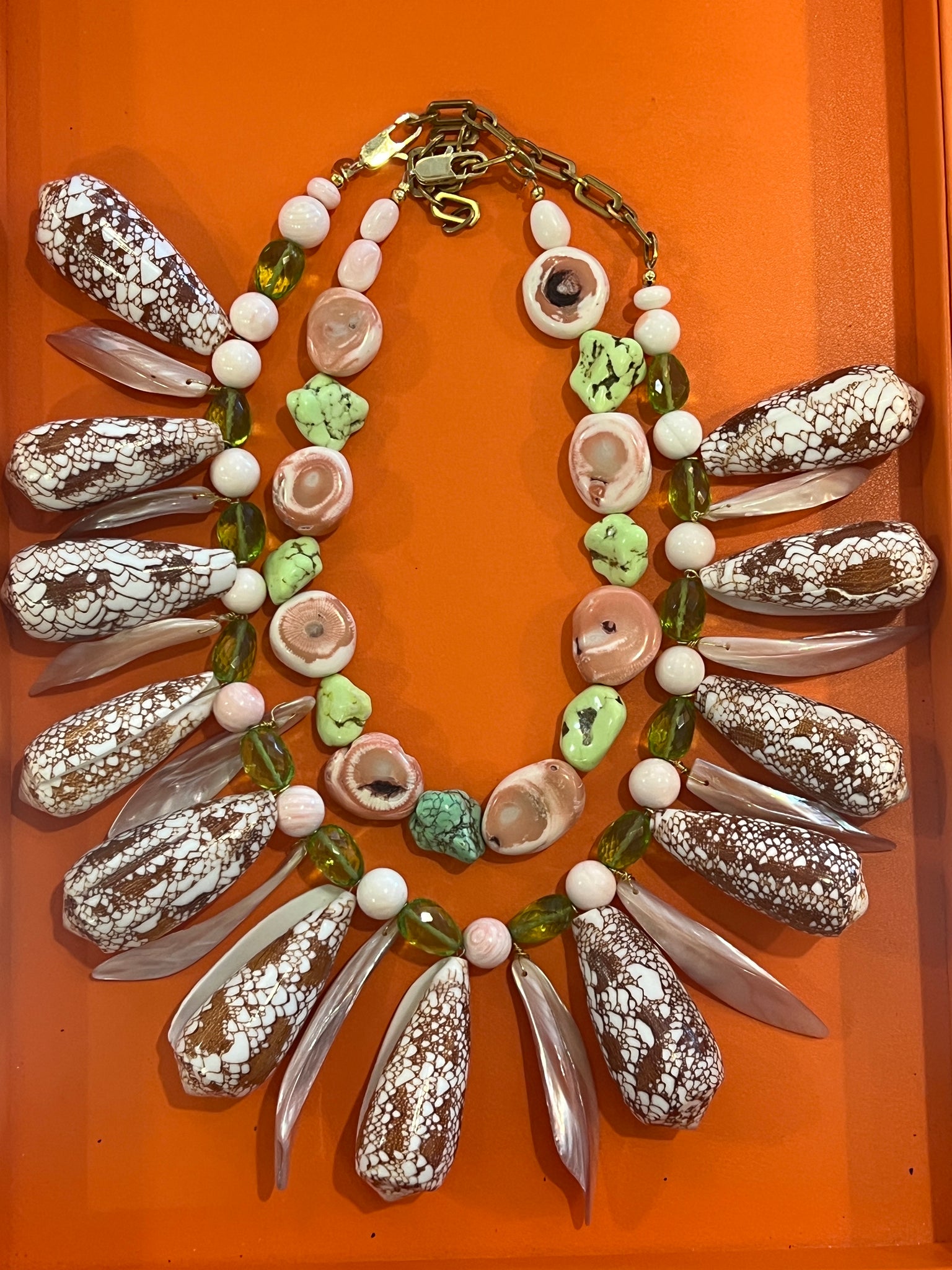 Fantastic necklace set that will stop Dolce Gabana in their tracks, as the inspiration comes straight from their Roman Runway Collection from last year. The choker is adjustable, as is the collar. They are made to be worn as a set, but can be worn separately. Made up of unusual Conus shells, Conch beads, cut Tennessee River Clams and really nice, big faceted Peridot Beads!