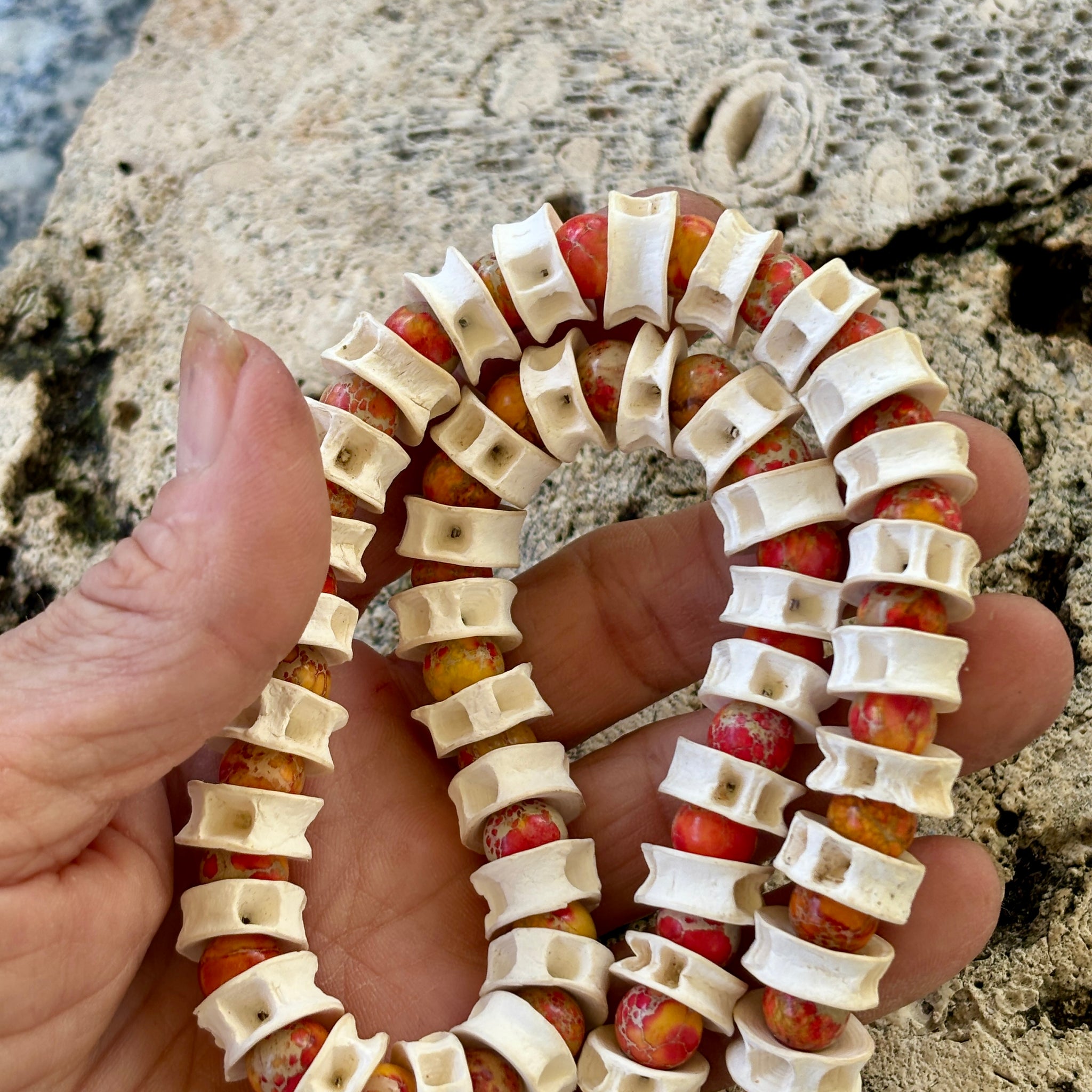 Ocean Sediment Jasper and Vertebra from a big fish. It's fascinating and good looking. Give one a try! Vermeil Closure - signed CSS -20" long