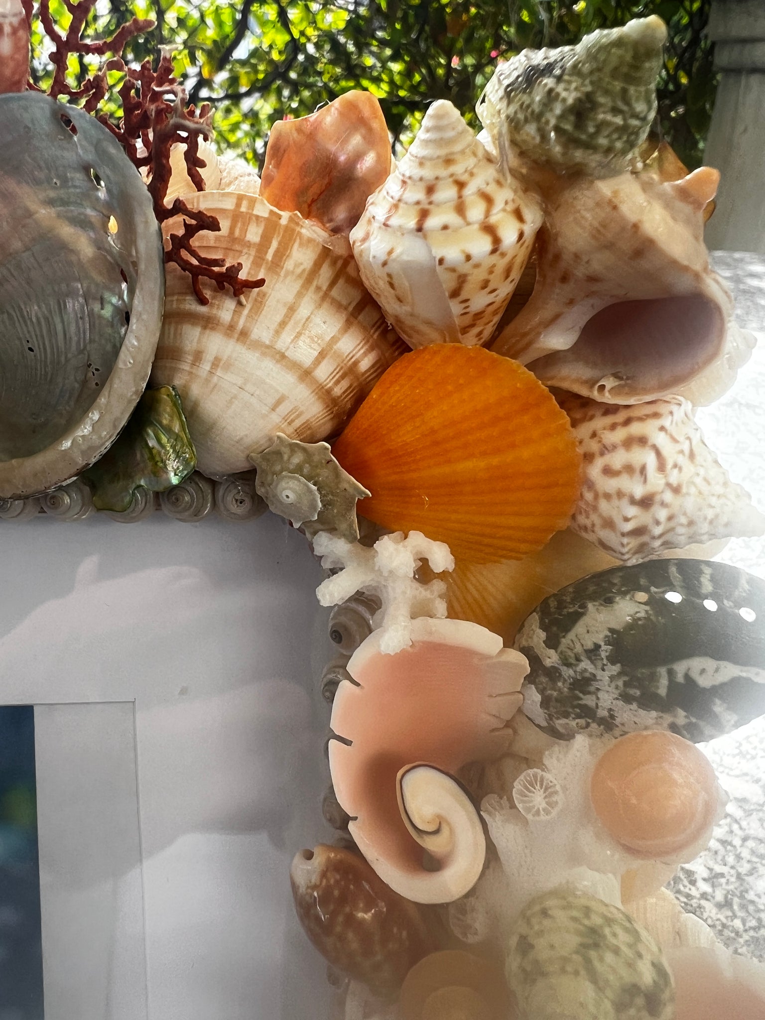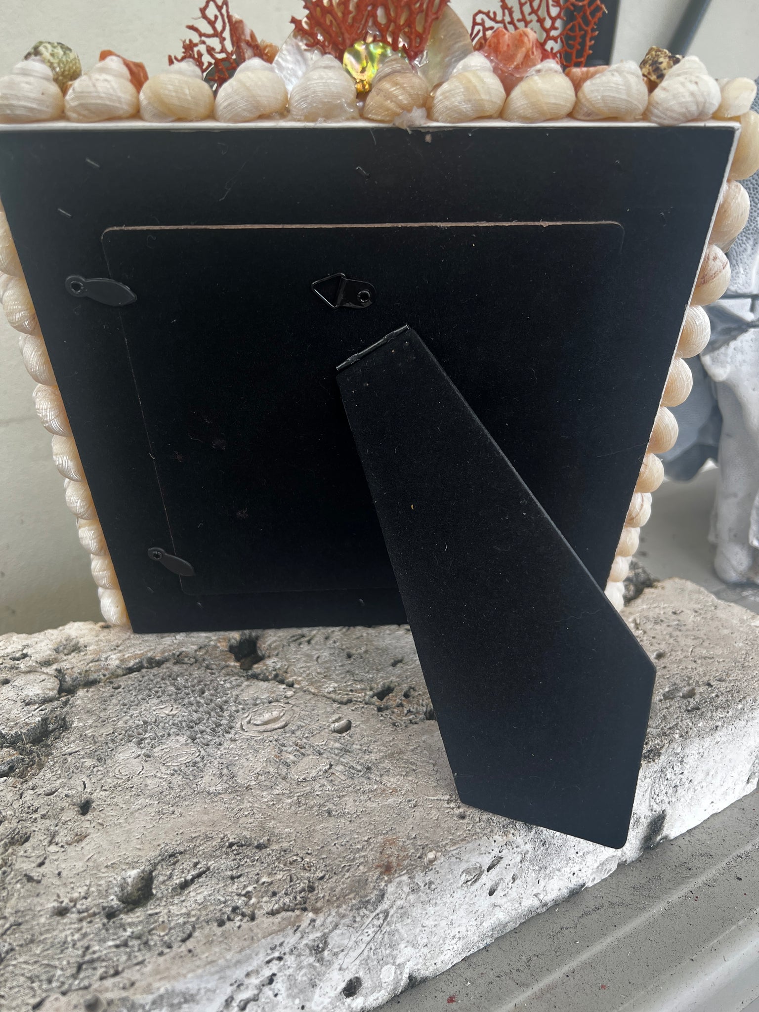 A lovely Christa's South Seashell photo frame - with orange, beige, green and white shells - a perfect piece for your favorite photo - 5.5' x 5.5" with an outside dimension of 9.5"w. x 10.25"h.