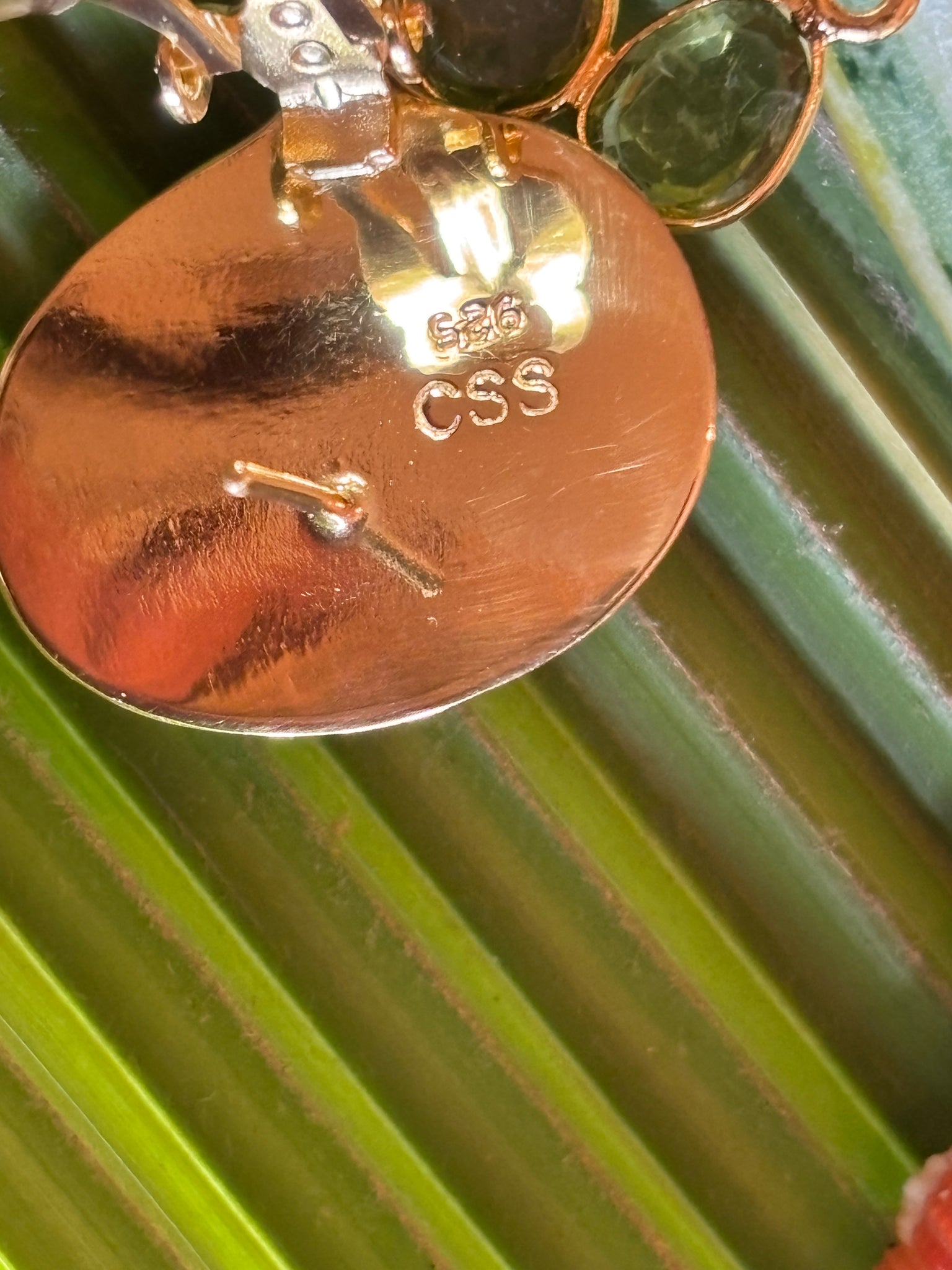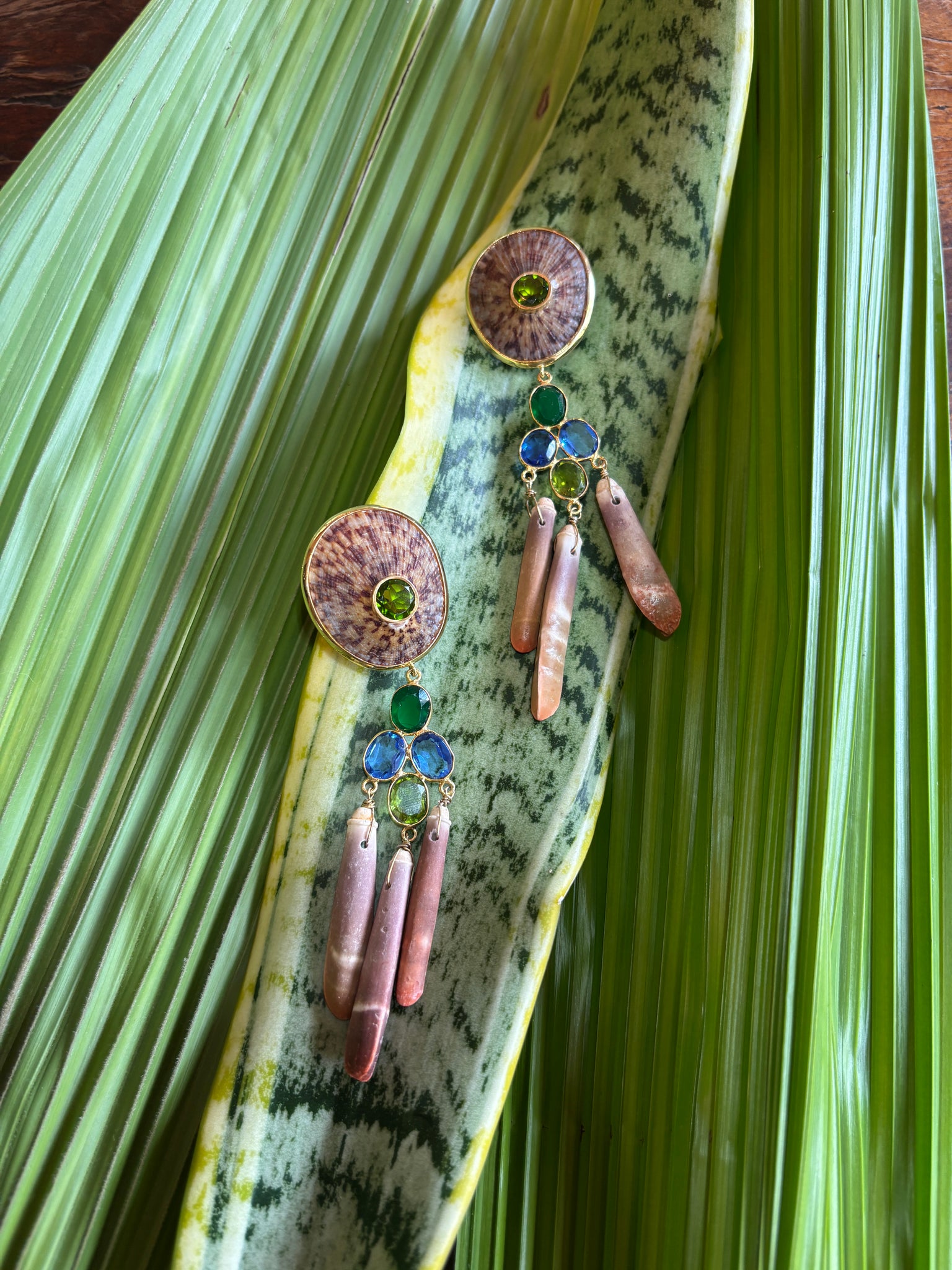 Fun, fun dangler earrings made with shell, Urchin Spines, Peridot, Topaz and Green garnet - Signed CSS - Vermeil - 4" Drop