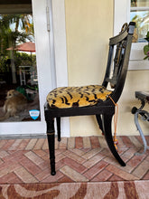 Beautiful, diminutive, painted, Regency side chairs with gold, Cleft-like frets. Brass handle on the top of stretcher. Cane seats and great Scalamandre Tiger velvet cushions with tassels at tie ends. Timeless and trés chic. Circa 1850